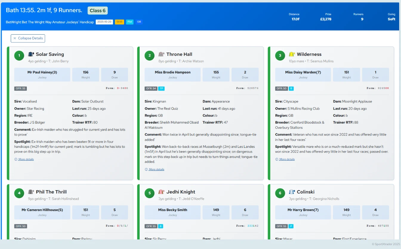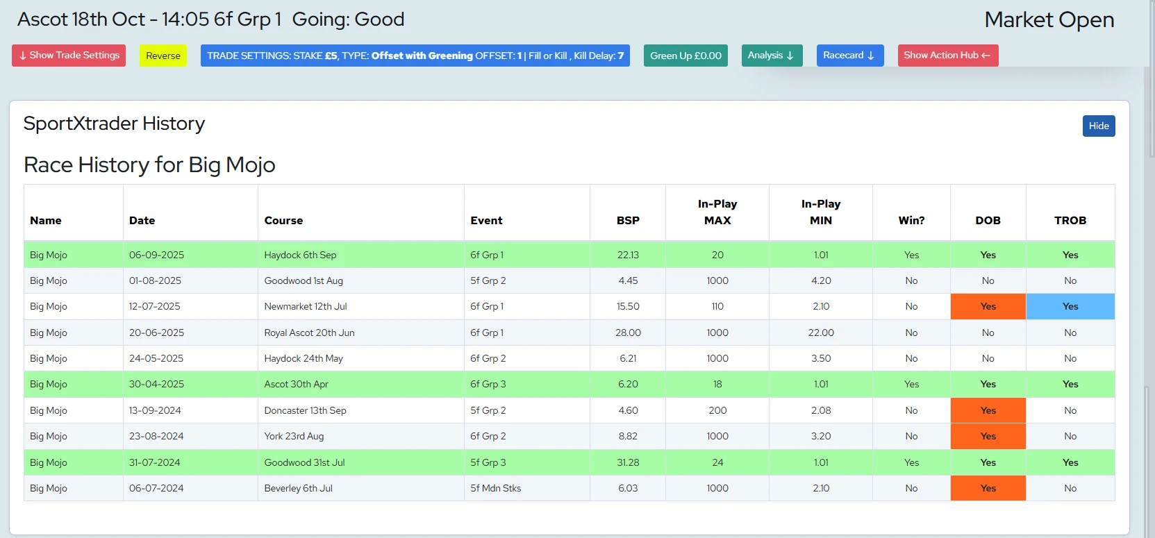 Racecard and historical analysis. See how each horse has performed in the past. Unique DOB and TROB history.